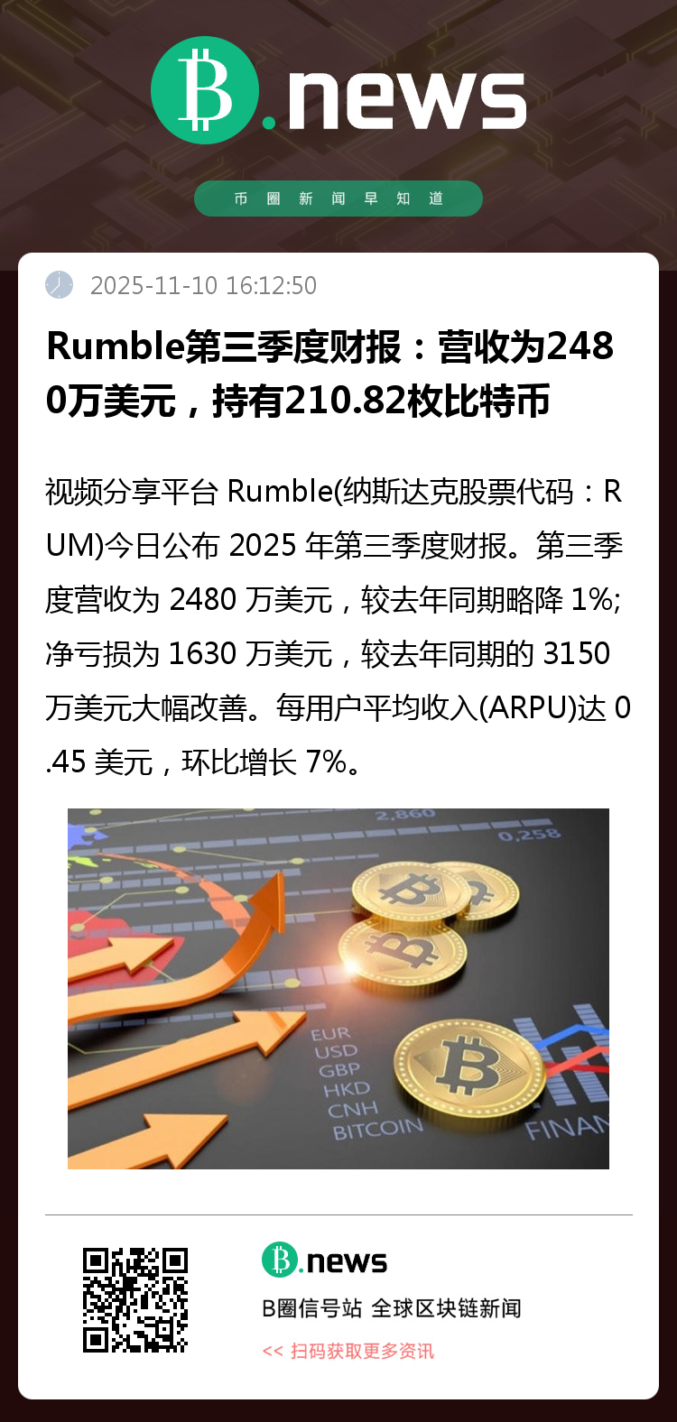 视频分享平台 Rumble(纳斯达克股票代码:RUM)今日公布 2025 年第三季度财报。第三季度营收为 2480 万美元,较去年同期略降 1%;净亏损为 1630 万美元,较去年同期的 3150 万美元大幅改善。每用户平均收入(ARPU)达 0.45 美元,环比增长 7%。