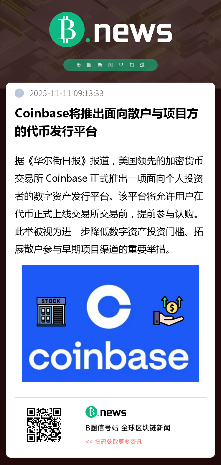 据《华尔街日报》报道,美国领先的加密货币交易所 Coinbase 正式推出一项面向个人投资者的数字资产发行平台。该平台将允许用户在代币正式上线交易所交易前,提前参与认购。此举被视为进一步降低数字资产投资门槛、拓展散户参与早期项目渠道的重要举措。