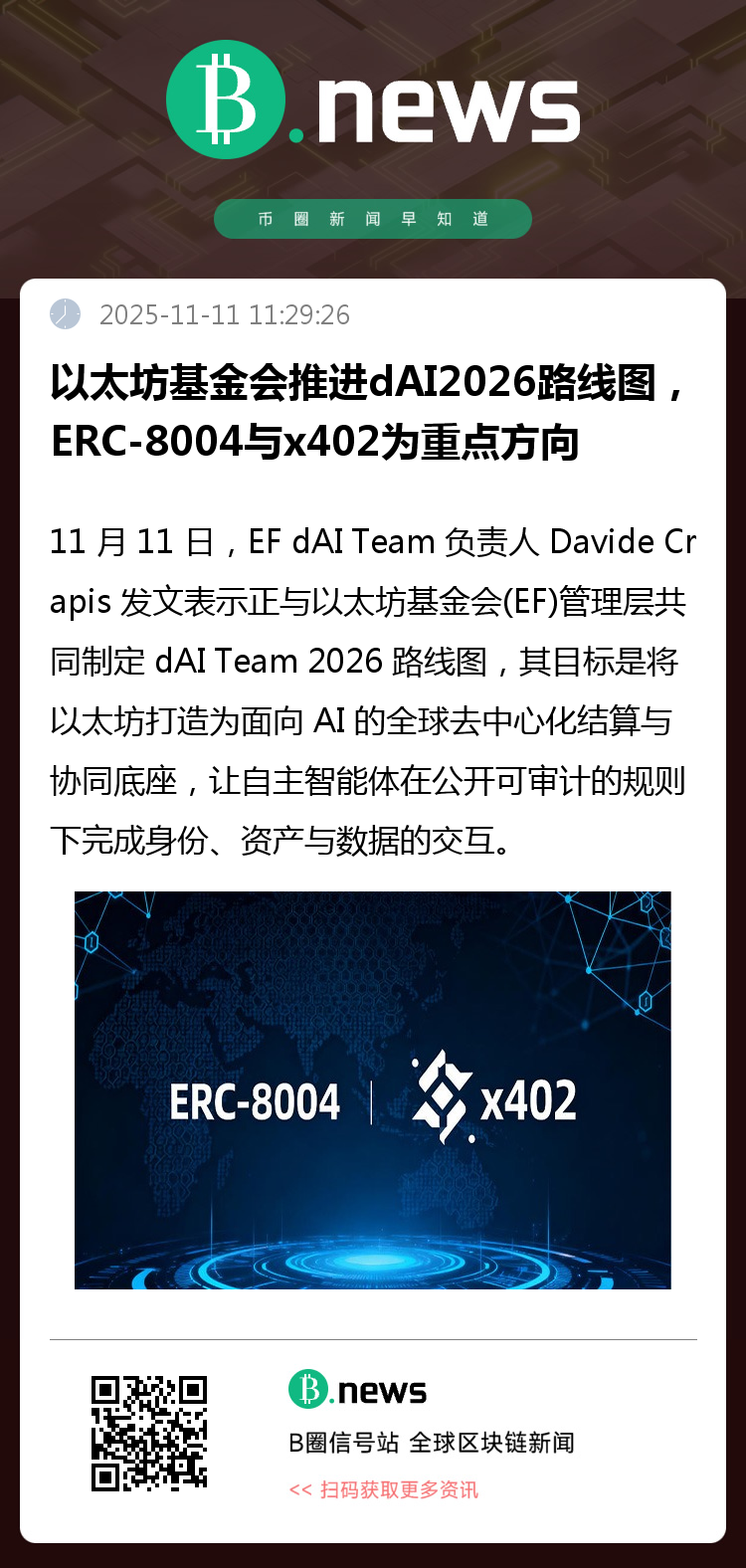 11 月 11 日,EF dAI Team 负责人 Davide Crapis 发文表示正与以太坊基金会(EF)管理层共同制定 dAI Team 2026 路线图,其目标是将以太坊打造为面向 AI 的全球去中心化结算与协同底座,让自主智能体在公开可审计的规则下完成身份、资产与数据的交互。Davide Crapis 同时对围绕 ERC-8004 与 x402 协议不断扩大的社区表示感谢,称这两项标准正成为「agentic commerce」的中立规范,并向正在构建相关应用的团队征询后续应重点支持的方向。