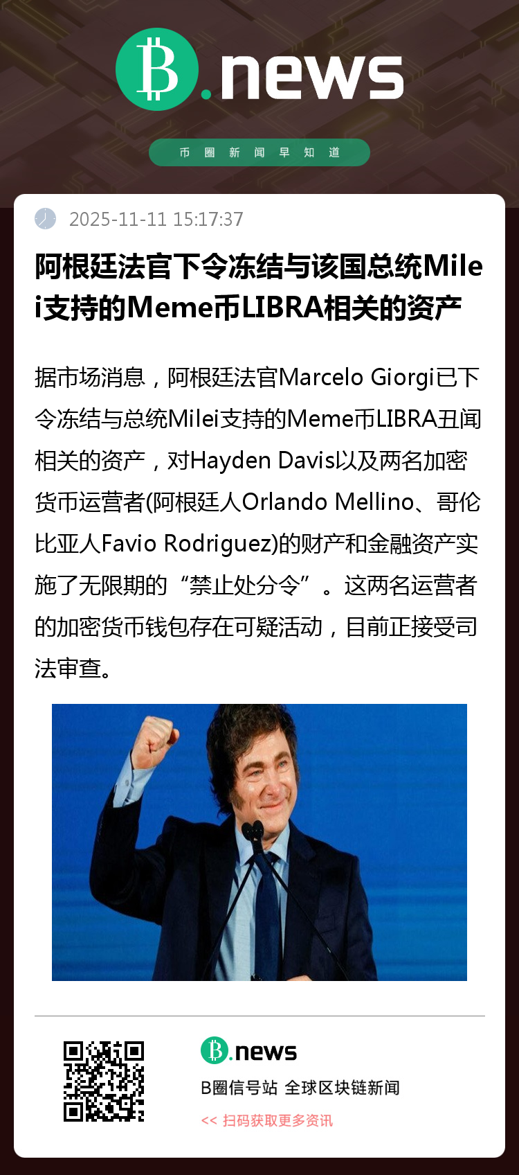 法官强调,禁止处分令只在严格必要的时间内有效,同时下令通知国家证券委员会,将资产冻结范围扩大至阿根廷境内所有相关平台。此外,检方发现,Milei发布与Davis自拍照的推文42分钟后,Davis就通过Bitget转移了50.75万美元,这些转账可能构成间接贿赂。