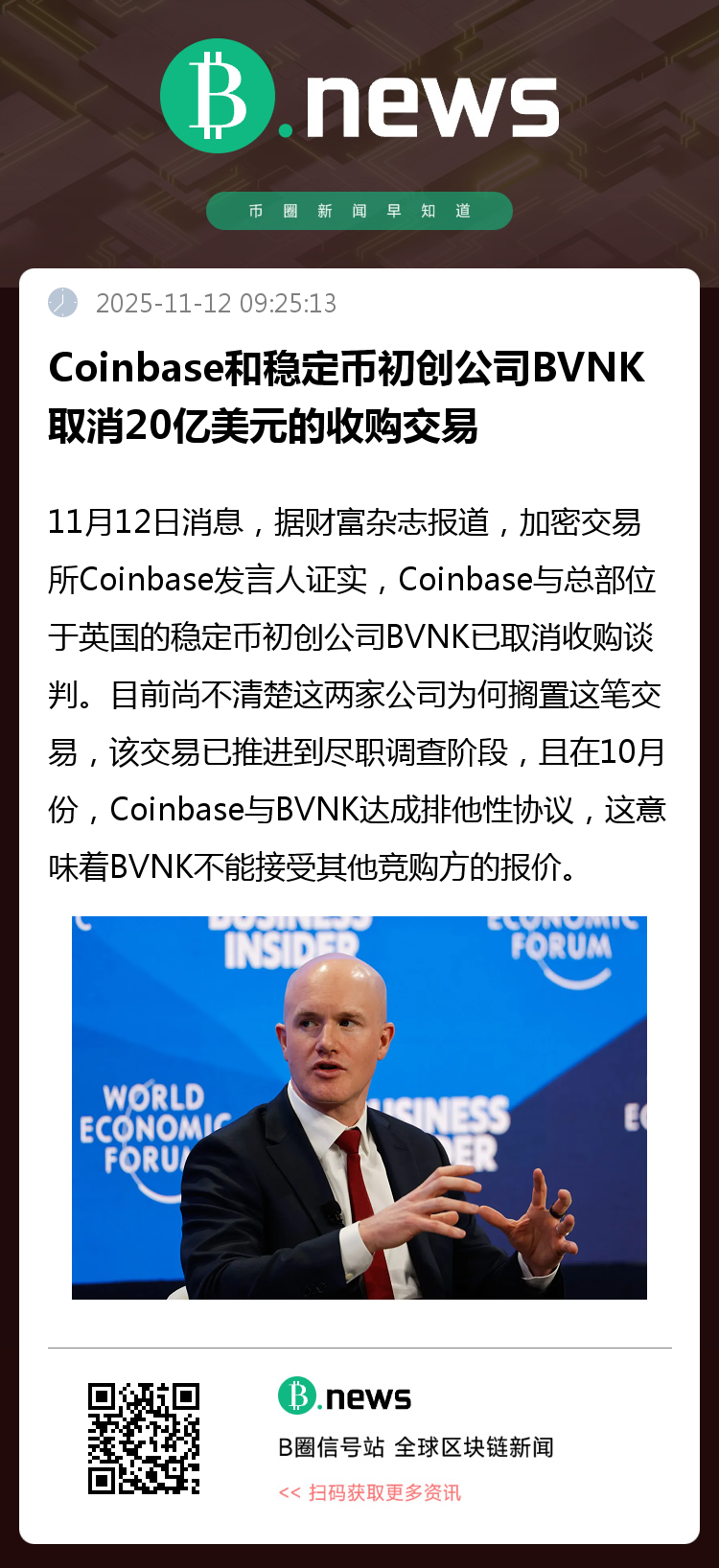 11月12日,据《财富》杂志报道,加密货币交易所Coinbase发言人确认,已终止与英国稳定币初创企业BVNK的收购谈判。目前双方暂停交易的具体原因尚未披露。此前,该收购事宜已进入尽职调查阶段,且在10月份Coinbase与BVNK达成了排他性协议,使BVNK无法接受其他竞购方报价。