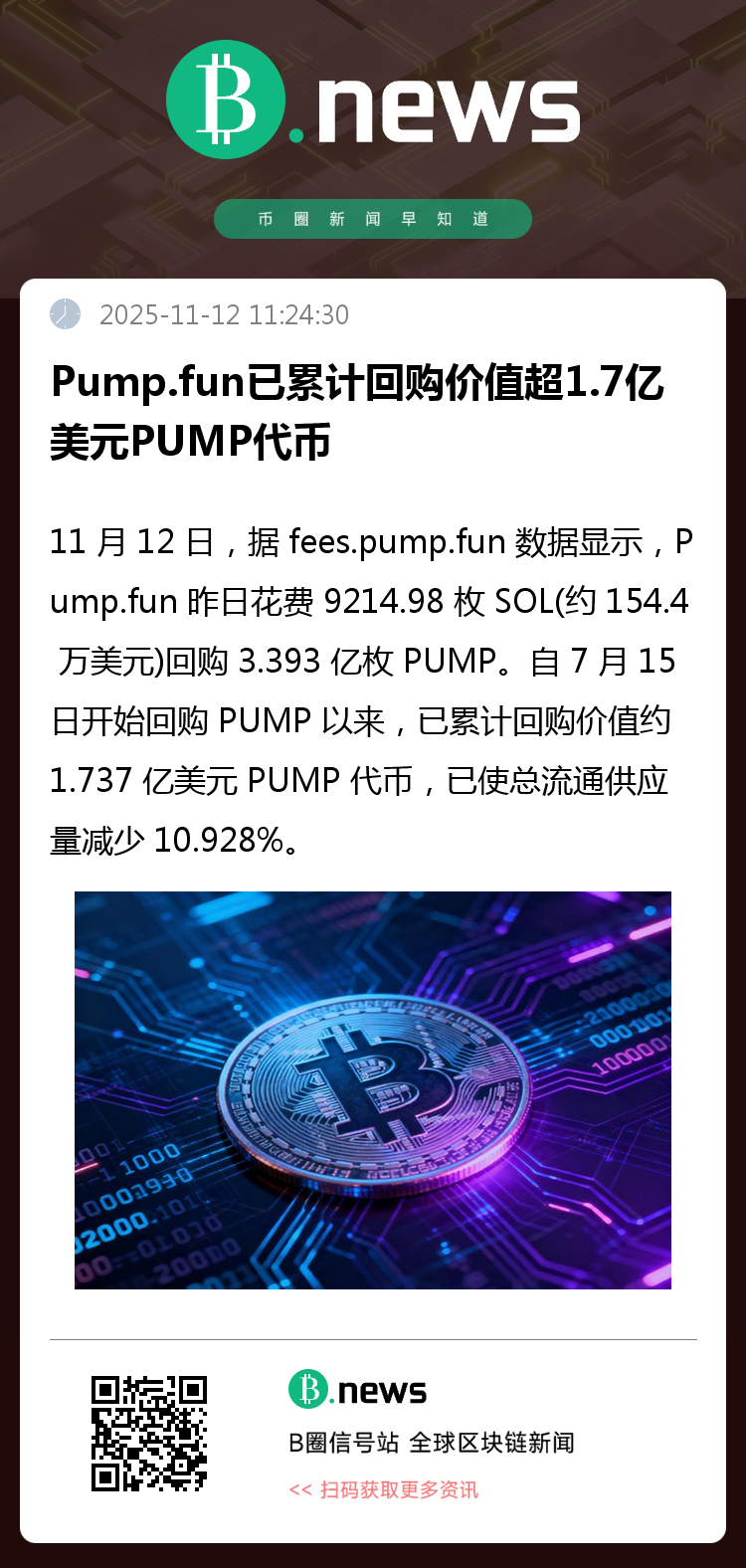 11 月 12 日,据 fees.pump.fun 数据显示,Pump.fun 昨日花费 9214.98 枚 SOL(约 154.4 万美元)回购 3.393 亿枚 PUMP。自 7 月 15 日开始回购 PUMP 以来,已累计回购价值约 1.737 亿美元 PUMP 代币,已使总流通供应量减少 10.928%。