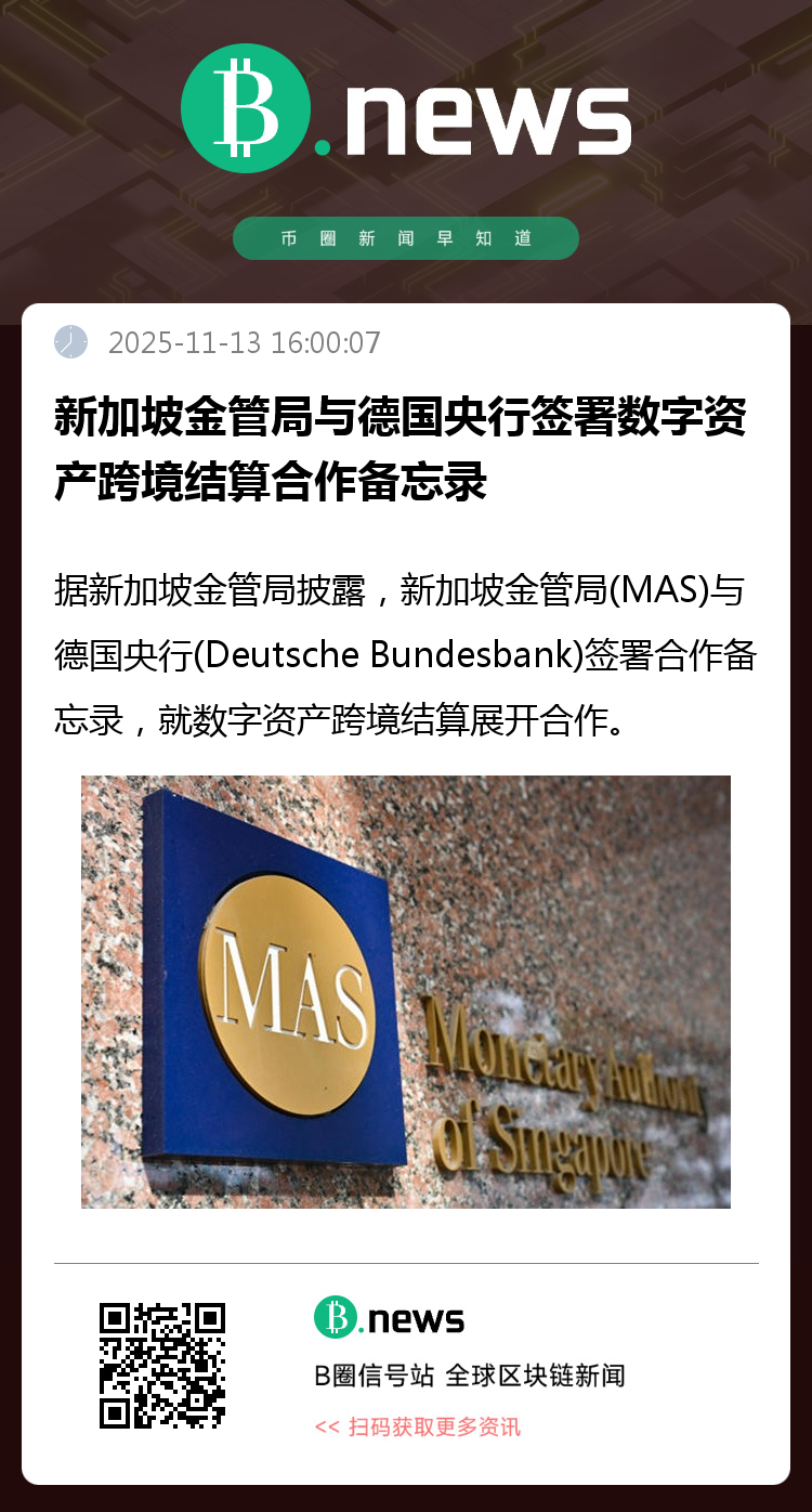 据新加坡金管局披露,新加坡金管局(MAS)与德国央行(Deutsche Bundesbank)签署合作备忘录,就数字资产跨境结算展开合作。