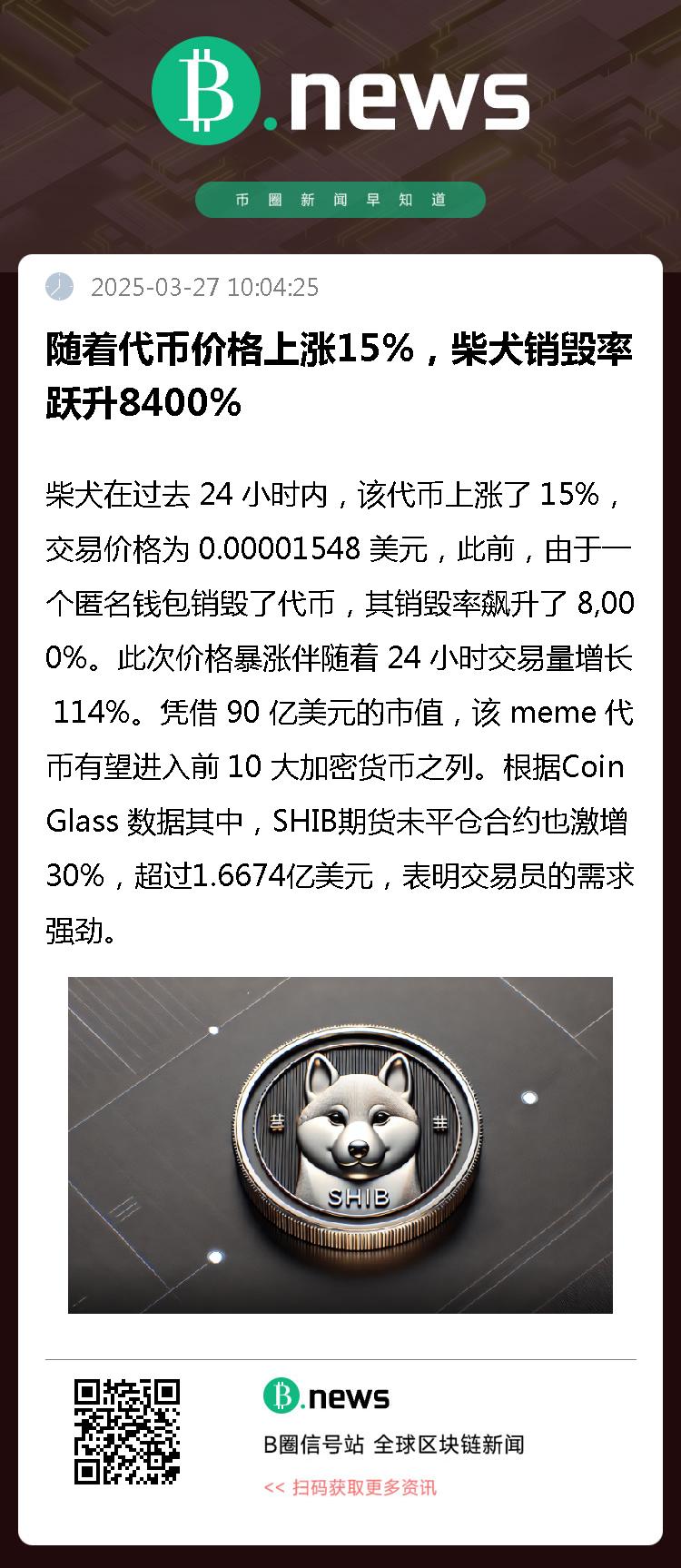 柴犬在过去 24 小时内,该代币上涨了 15%,交易价格为 0.00001548 美元,此前,由于一个匿名钱包销毁了代币,其销毁率飙升了 8,000%。此次价格暴涨伴随着 24 小时交易量增长 114%。凭借 90 亿美元的市值,该 meme 代币有望进入前 10 大加密货币之列。