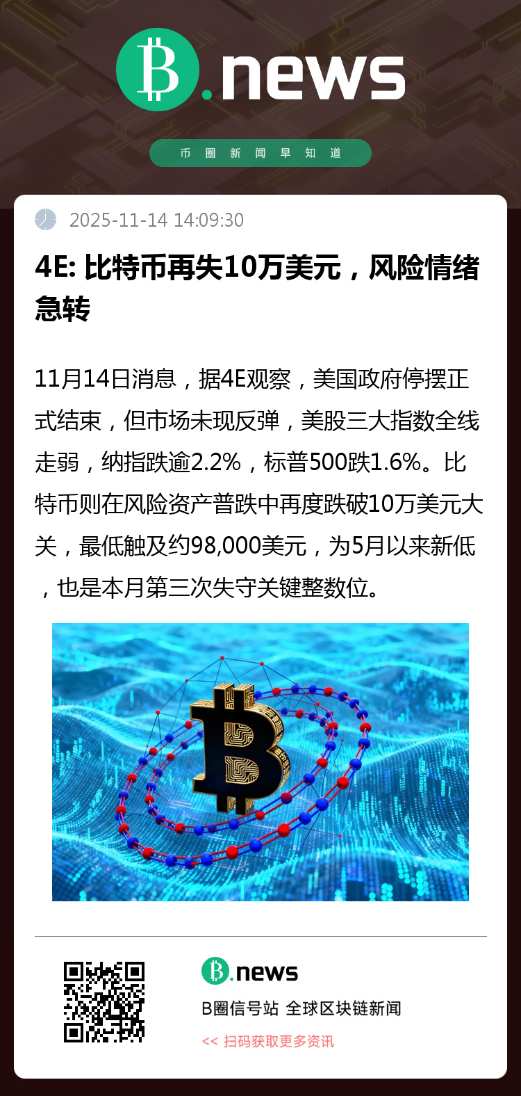 4E点评:短期市场处于“强波动 + 弱预期”阶段,宏观压力与情绪面共同压制比特币走势。但从DEX活跃度上升到主权基金入场,长期资金仍在布局,熊市信号尚未完全坐实。