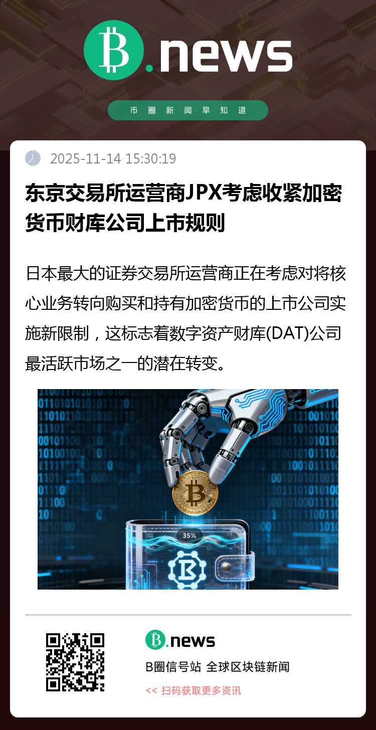 日本最大的证券交易所运营商正在考虑对将核心业务转向购买和持有加密货币的上市公司实施新限制,这标志着数字资产财库(DAT)公司最活跃市场之一的潜在转变。