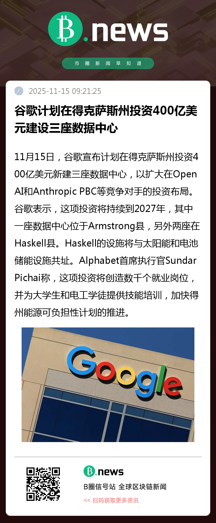 11月15日,谷歌正式宣布一项重大投资计划,将在美国得克萨斯州投入高达400亿美元,新建三座大型数据中心,以进一步增强其在人工智能和云计算领域的基础设施能力,应对来自OpenAI、Anthropic PBC等科技公司在AI领域日益激烈的竞争。