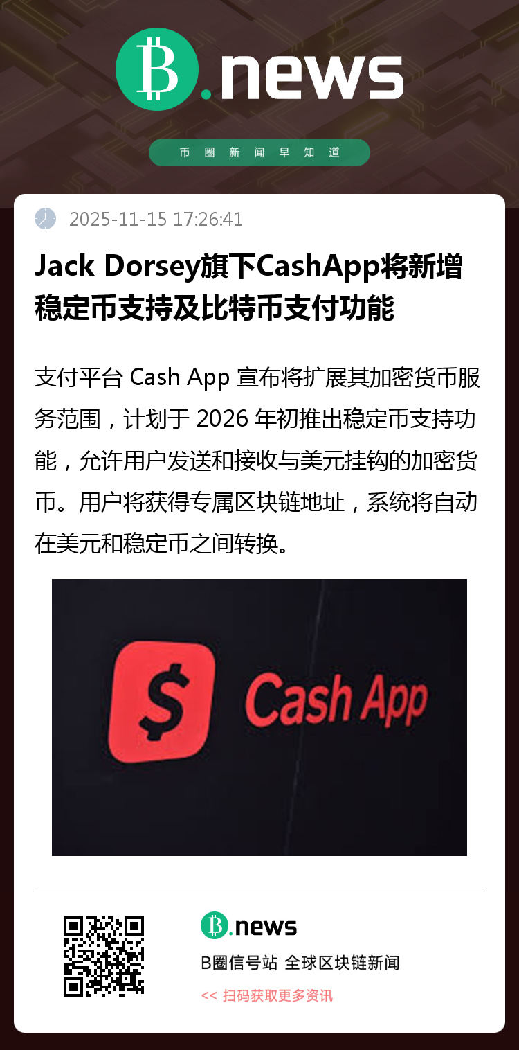 支付平台 Cash App 宣布将扩展其加密货币服务范围,计划于 2026 年初推出稳定币支持功能,允许用户发送和接收与美元挂钩的加密货币。用户将获得专属区块链地址,系统将自动在美元和稳定币之间转换。此外,Cash App 还将新增商户比特币支付功能,用户无需持有比特币,只需扫描商家二维码,平台会自动将用户现金转换为比特币完成支付。作为一家“比特币优先”的公司,此举显示即使是比特币坚定支持者也开始关注稳定币领域的发展潜力。该领域近期活跃,包括 Stripe 收购 Bridge、特朗普签署 Genius 法案以及 Mastercard 洽购稳定币公司等事件。