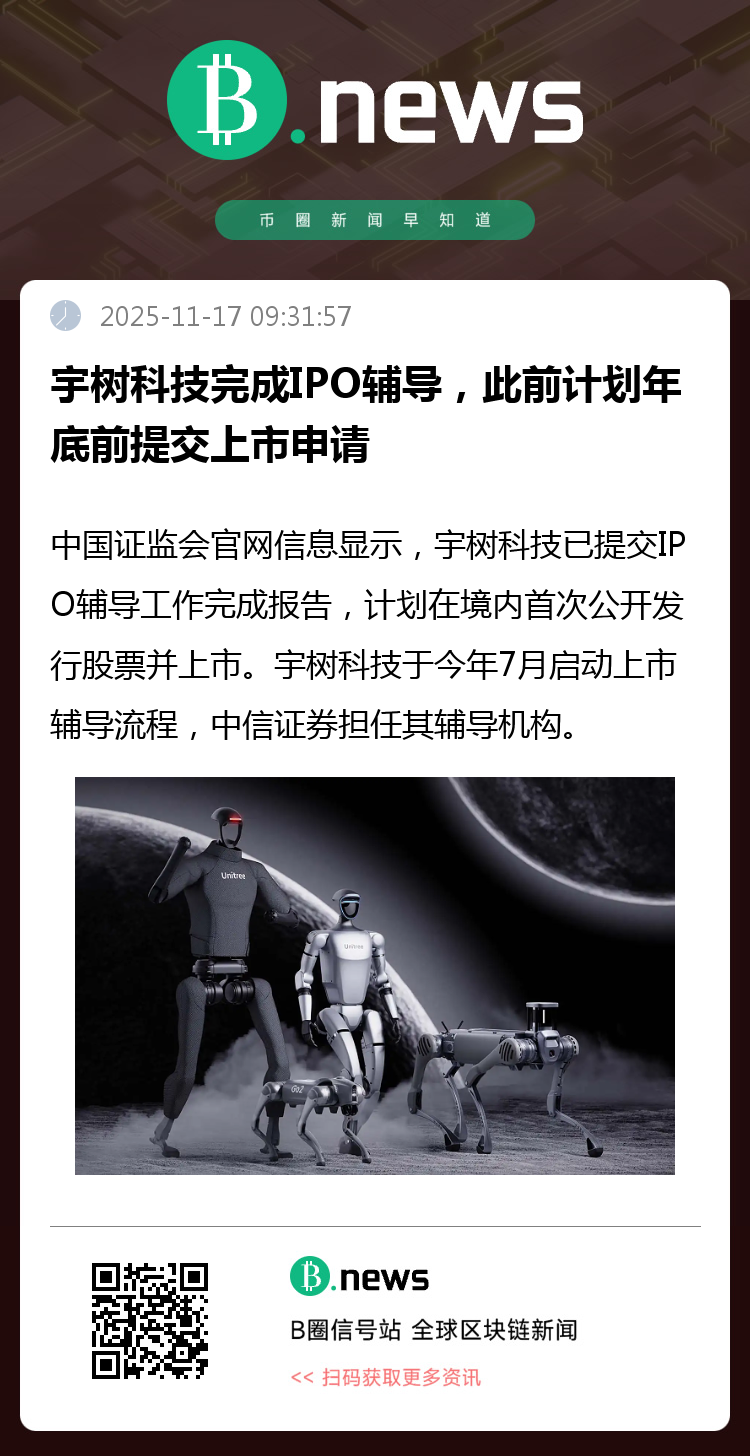 中国证监会官网信息显示,宇树科技已提交IPO辅导工作完成报告,计划在境内首次公开发行股票并上市。