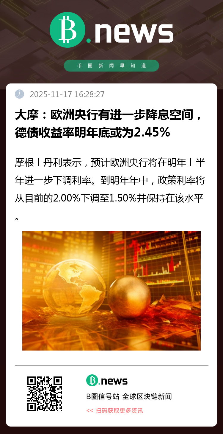 摩根士丹利表示,预计欧洲央行将在明年上半年进一步下调利率。到明年年中,政策利率将从目前的2.00%下调至1.50%并保持在该水平。策略师指出:“经济增长疲软、通胀低于预期,加之财政刺激有限,都推动欧洲央行进一步宽松。”在此背景下,摩根士丹利预计10年期德债收益率到2026年底将约为2.45%。根据LSEG数据,货币市场预期欧洲央行将在2026年6月降息近10个基点。