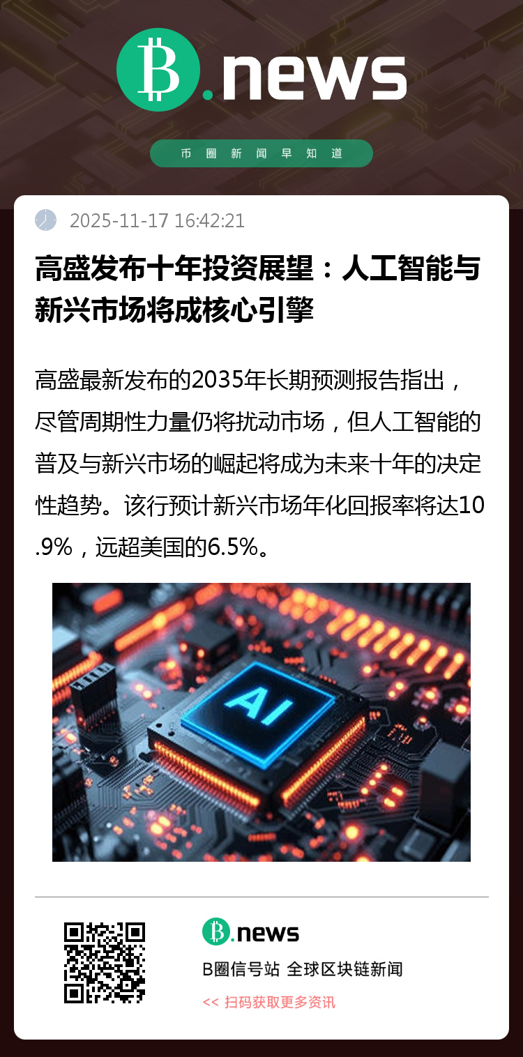 高盛集团指出,人工智能与新兴市场必将定义下一个十年。这家投资银行于上周三发布的《高盛十年全球展望》报告,系统阐述了其对截至2035年的市场预期。这份着眼长远的报告旨在对其经济学家的预测形成补充。