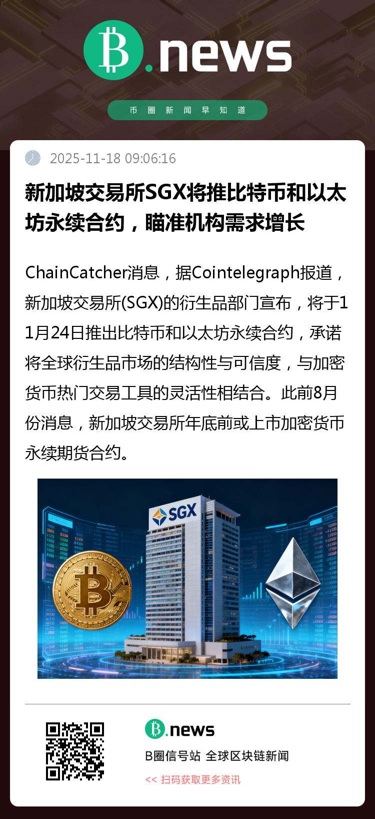 ChainCatcher最新消息显示,据Cointelegraph报道,新加坡交易所(SGX)旗下衍生品部门正式宣布,将于今年11月24日推出比特币和以太坊永续合约。这一举措标志着传统金融基础设施与数字资产领域的进一步融合,旨在将全球成熟衍生品市场的结构性、透明度与可信度,带入快速发展的加密货币交易领域。