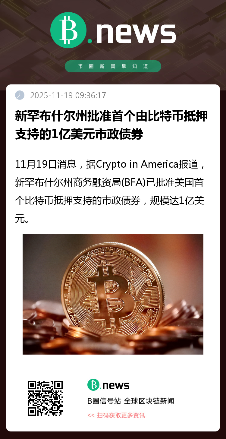 11月19日,据美国加密行业媒体Crypto in America报道,新罕布什尔州商务融资局(Business Finance Authority,简称BFA)正式批准发行美国首例以比特币作为抵押担保的市政债券,规模达1亿美元,标志着加密货币在公共融资领域迈出关键一步。