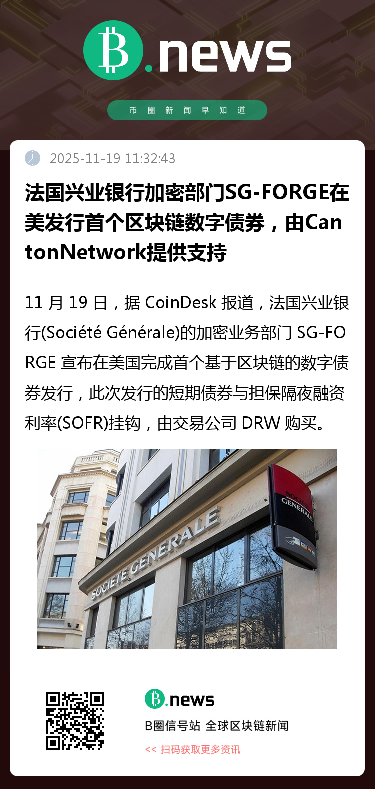11 月 19 日,据 CoinDesk 报道,法国兴业银行(Société Générale)的加密业务部门 SG-FORGE 宣布在美国完成首个基于区块链的数字债券发行,此次发行的短期债券与担保隔夜融资利率(SOFR)挂钩,由交易公司 DRW 购买。
