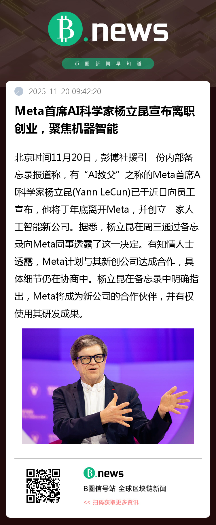 北京时间11月20日,彭博社援引一份内部备忘录报道称,有“AI教父”之称的Meta首席AI科学家杨立昆(Yann LeCun)已于近日向员工宣布,他将于年底离开Meta,并创立一家人工智能新公司。