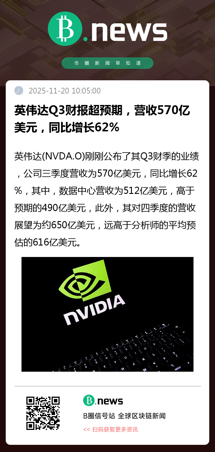 英伟达(NVDA.O)刚刚公布了其Q3财季的业绩,其作为人工智能热潮核心的芯片销量增长速度超过了华尔街预期,同时公司给出强劲的当季营收预测,这让投资者相信人工智能投资狂潮将持续下去。其Q3财报显示,公司三季度营收为570亿美元,同比增长62%,其中,数据中心营收为512亿美元,高于预期的490亿美元,此外,其对四季度的营收展望为约650亿美元,远高于分析师的平均预估的616亿美元。财报发布后,英伟达(NVDA.O)盘后股价上涨逾4%。英伟达CEO黄仁勋表示:“Blackwell的销量爆表,云GPU更是全部售罄。”此前,黄仁勋已经淡化了人们对人工智能泡沫的担忧。