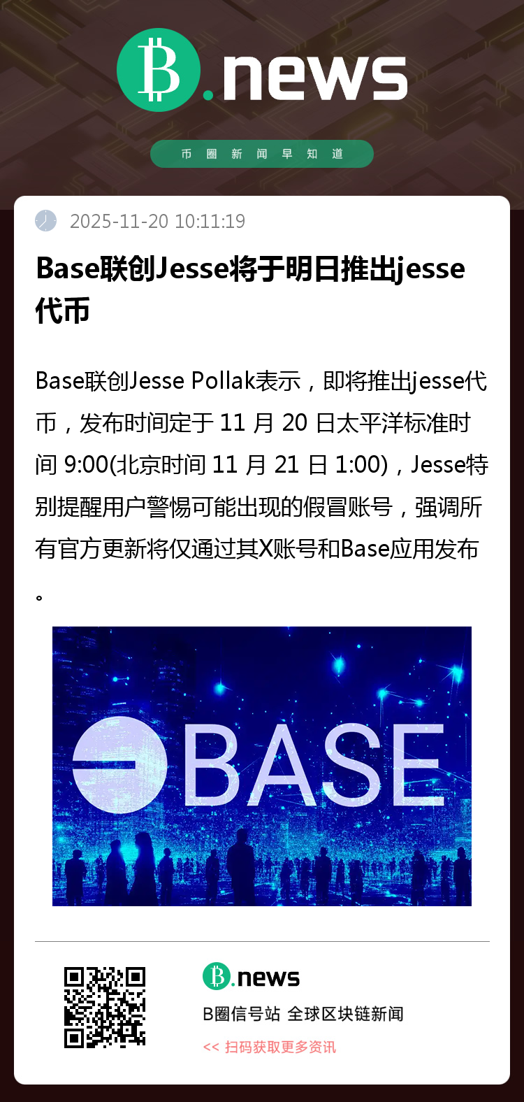 Base联创Jesse Pollak表示,即将推出 jesse代币,发布时间定于 11 月 20 日太平洋标准时间 9:00(北京时间 11 月 21 日 1:00),Jesse特别提醒用户警惕可能出现的假冒账号,强调所有官方更新将仅通过其X账号和Base应用发布。