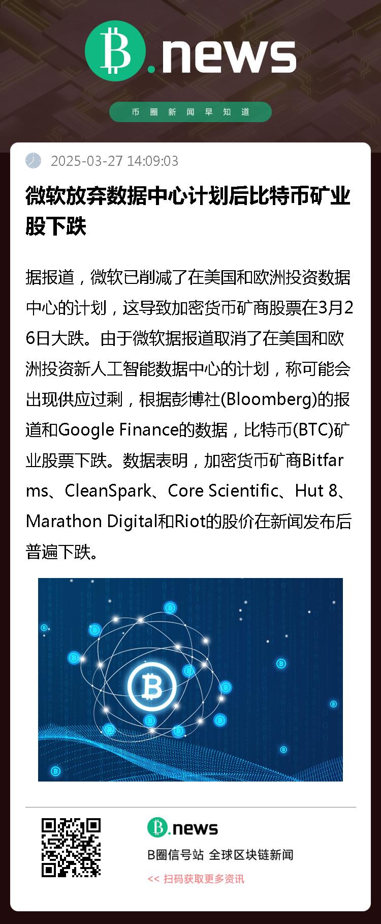 据报道,微软已削减了在美国和欧洲投资数据中心的计划,这导致加密货币矿商股票在3月26日大跌。