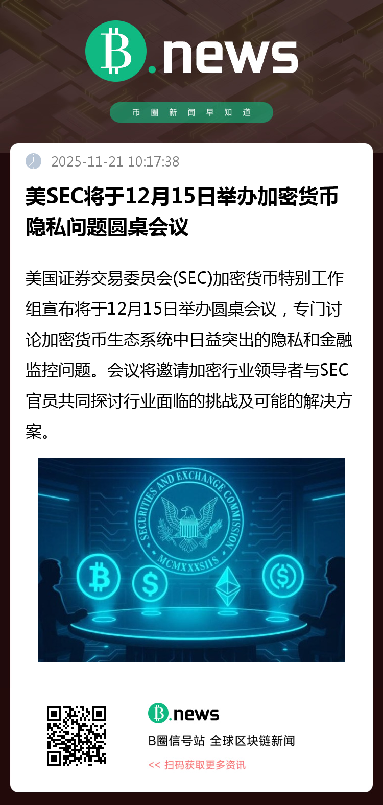 11 月 21 日,据 Cryptopolitan 报道,美国证券交易委员会(SEC)加密货币特别工作组宣布将于12月15日举办圆桌会议,专门讨论加密货币生态系统中日益突出的隐私和金融监控问题。会议将邀请加密行业领导者与SEC官员共同探讨行业面临的挑战及可能的解决方案。