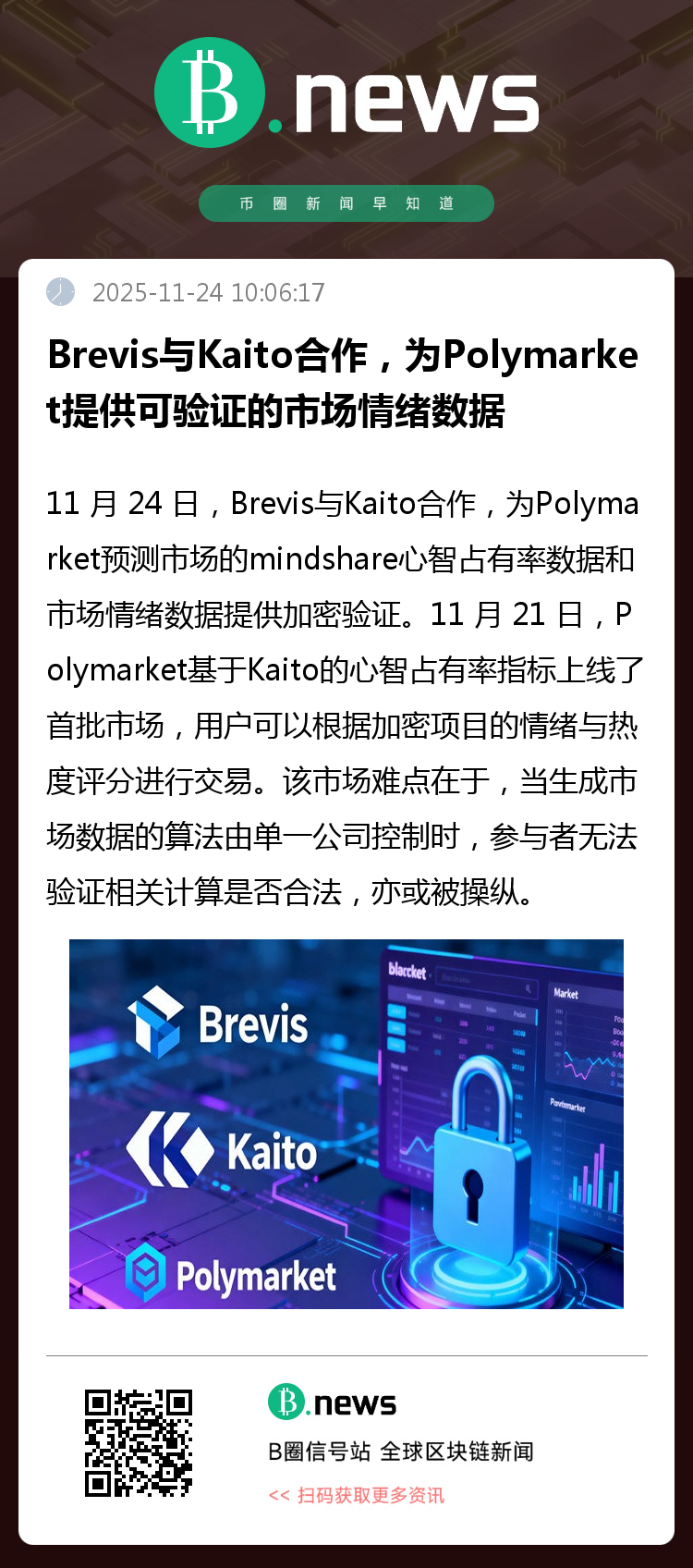 11 月 24 日,Brevis与Kaito合作,为Polymarket预测市场的mindshare心智占有率数据和市场情绪数据提供加密验证。11 月 21 日,Polymarket基于Kaito的心智占有率指标上线了首批市场,用户可以根据加密项目的情绪与热度评分进行交易。该市场难点在于,当生成市场数据的算法由单一公司控制时,参与者无法验证相关计算是否合法,亦或被操纵。