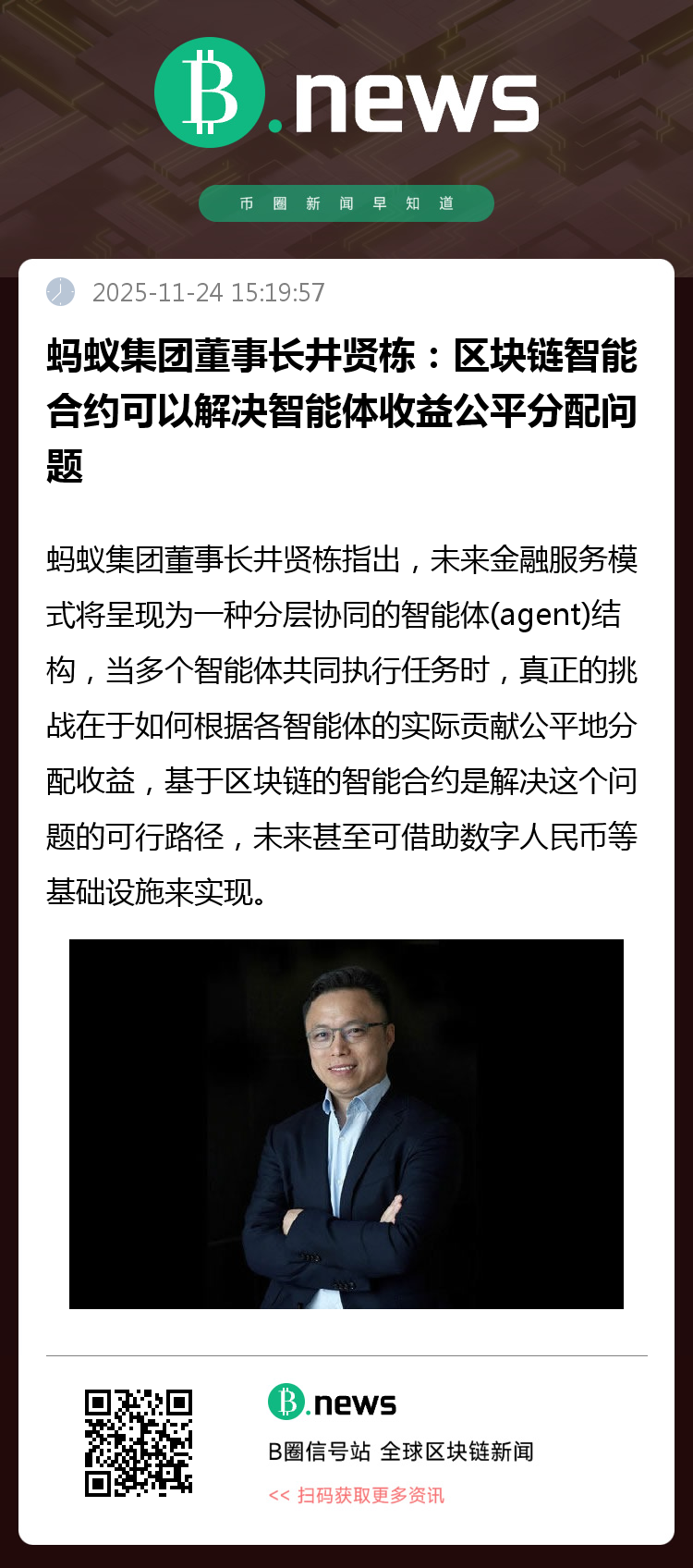 11月24日,据财新网报道,蚂蚁集团董事长井贤栋指出,未来金融服务模式将呈现为一种分层协同的智能体(agent)结构,当多个智能体共同执行任务时,真正的挑战在于如何根据各智能体的实际贡献公平地分配收益,基于区块链的智能合约是解决这个问题的可行路径,未来甚至可借助数字人民币等基础设施来实现。当系统前端接收到一项服务的收入时,能够通过智能合约自动、透明地与参与协作的各个智能体进行收益分配。