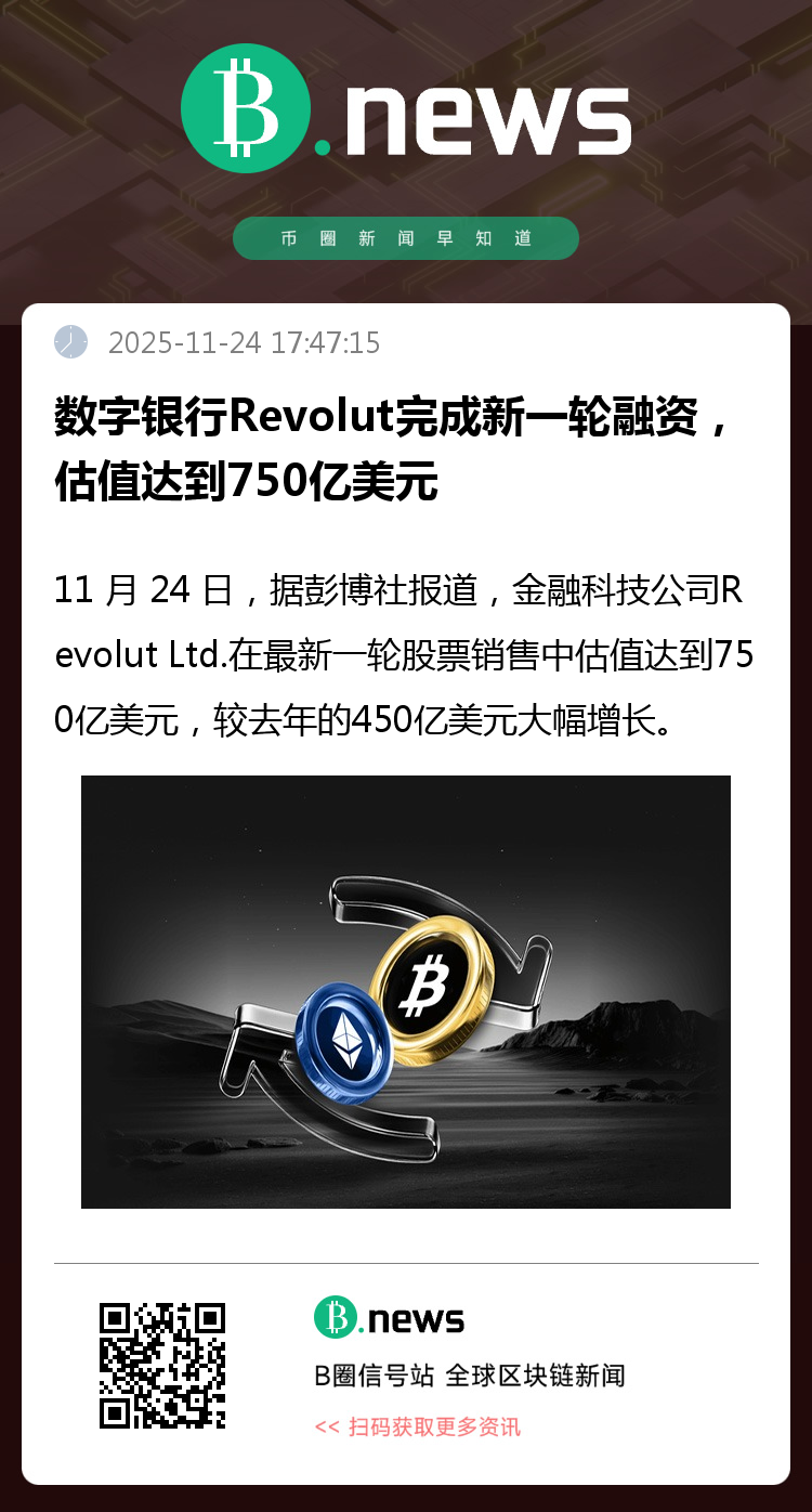 11 月 24 日,据彭博社报道,金融科技公司Revolut Ltd.在最新一轮股票销售中估值达到750亿美元,较去年的450亿美元大幅增长。此轮融资由Coatue、Greenoaks、Dragoneer和Fidelity Management & Research Company领投,Nvidia的风投部门NVentures、Andreessen Horowitz、Franklin Templeton以及T. Rowe Price管理的账户也参与其中。Revolut提供支票和储蓄账户、国际汇款、加密货币和股票交易等服务。