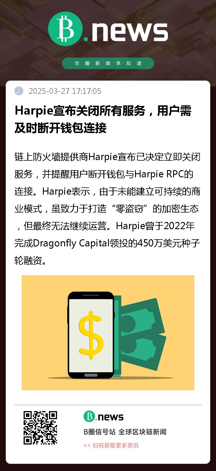 链上防火墙提供商Harpie宣布已决定立即关闭服务,并提醒用户断开钱包与Harpie RPC的连接。Harpie表示,由于未能建立可持续的商业模式,虽致力于打造“零盗窃”的加密生态,但最终无法继续运营。