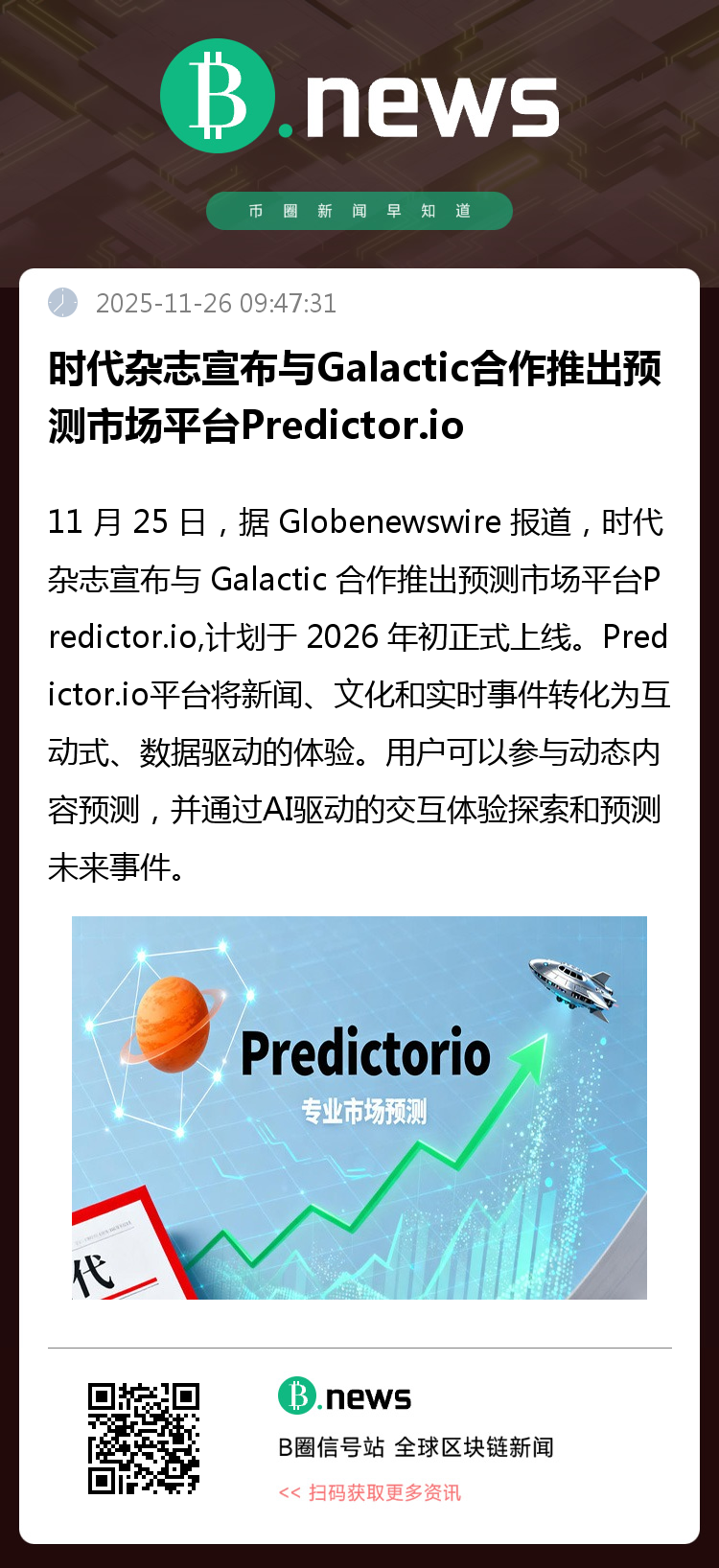 11 月 25 日,据 Globenewswire 报道,时代杂志宣布与Galactic合作推出预测市场平台Predictor.io,计划于2026 年初正式上线。