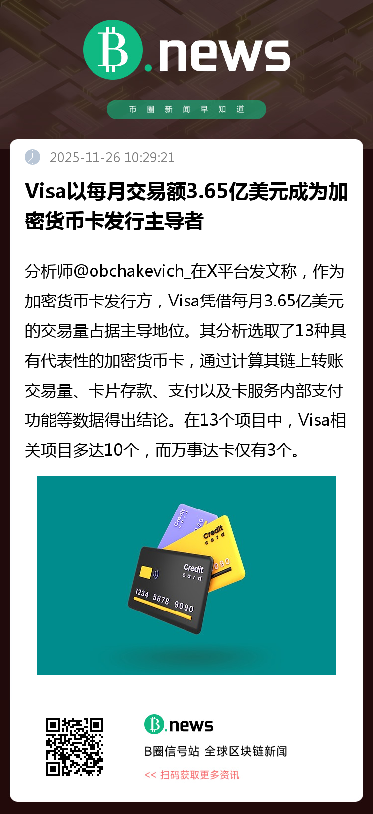 分析师@obchakevich_在X平台发文称,作为加密货币卡发行方,Visa凭借每月3.65亿美元的交易量占据主导地位。
