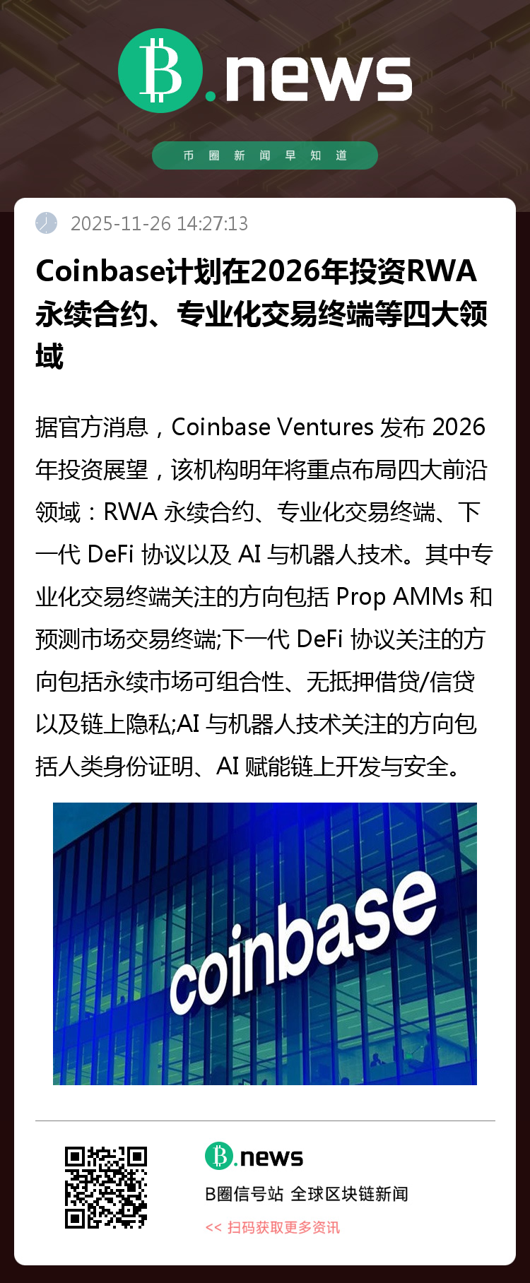 据官方消息,Coinbase Ventures 发布 2026 年投资展望,该机构明年将重点布局四大前沿领域:RWA 永续合约、专业化交易终端、下一代 DeFi 协议以及 AI 与机器人技术。其中专业化交易终端关注的方向包括 Prop AMMs 和预测市场交易终端;下一代 DeFi 协议关注的方向包括永续市场可组合性、无抵押借贷/信贷以及链上隐私;AI 与机器人技术关注的方向包括人类身份证明、AI 赋能链上开发与安全。