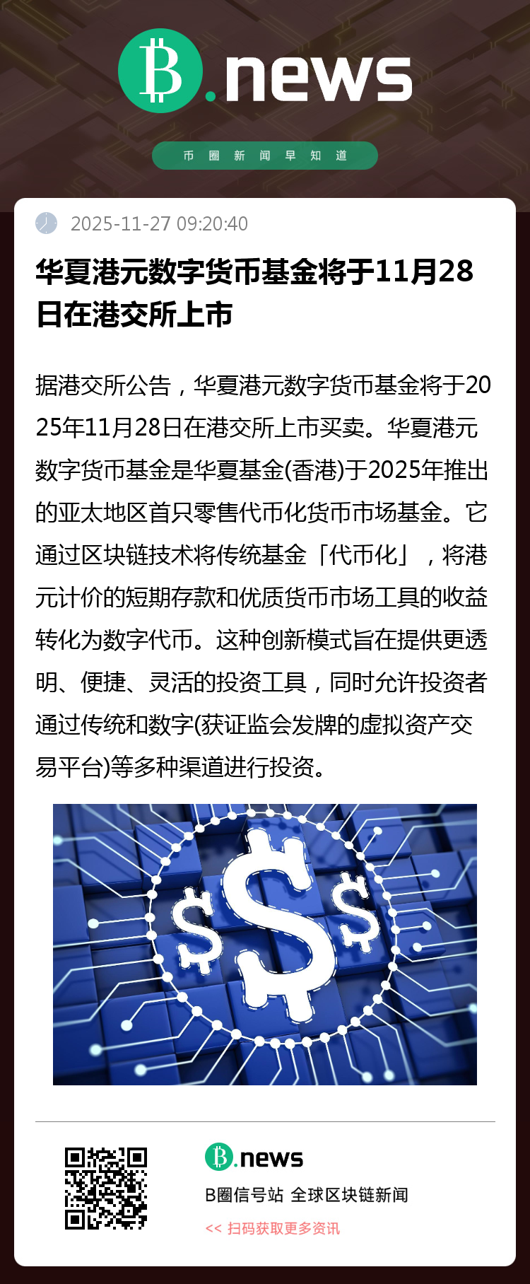 据港交所最新公告,华夏基金(香港)发行的华夏港元数字货币基金(股份代号:3471)已确认将于2025年11月28日正式登陆香港交易所挂牌交易。该基金不仅是华夏基金(香港)在2025年的重要创新产品,更是亚太地区首只面向零售投资者的代币化货币市场基金,标志着数字资产与传统金融工具融合的重要里程碑。