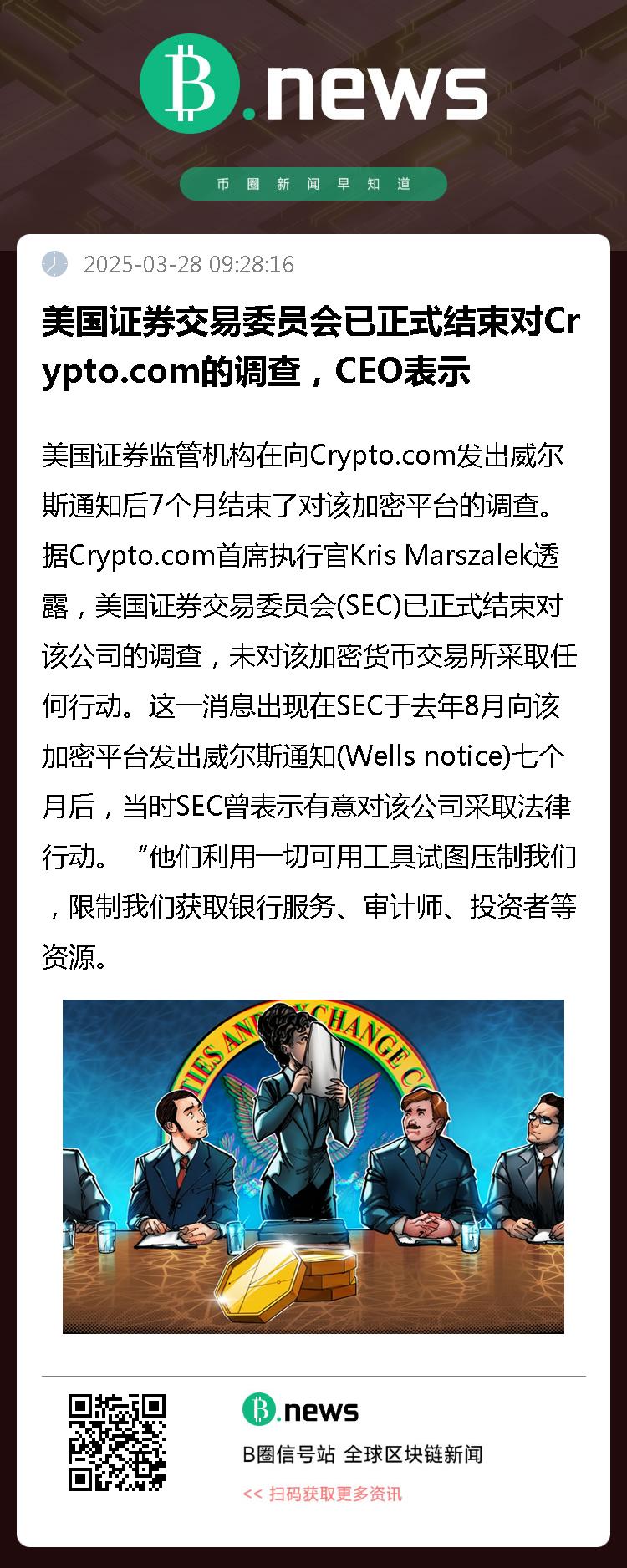 据Crypto.com首席执行官Kris Marszalek透露,美国证券交易委员会(SEC)已正式结束对该公司的调查,未对该加密货币交易所采取任何行动。