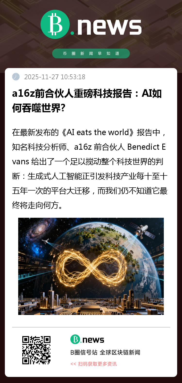 在最新发布的《AI eats the world》报告中,知名科技分析师、a16z 前合伙人 Benedict Evans 给出了一个足以搅动整个科技世界的判断:生成式人工智能正引发科技产业每十至十五年一次的平台大迁移,而我们仍不知道它最终将走向何方。