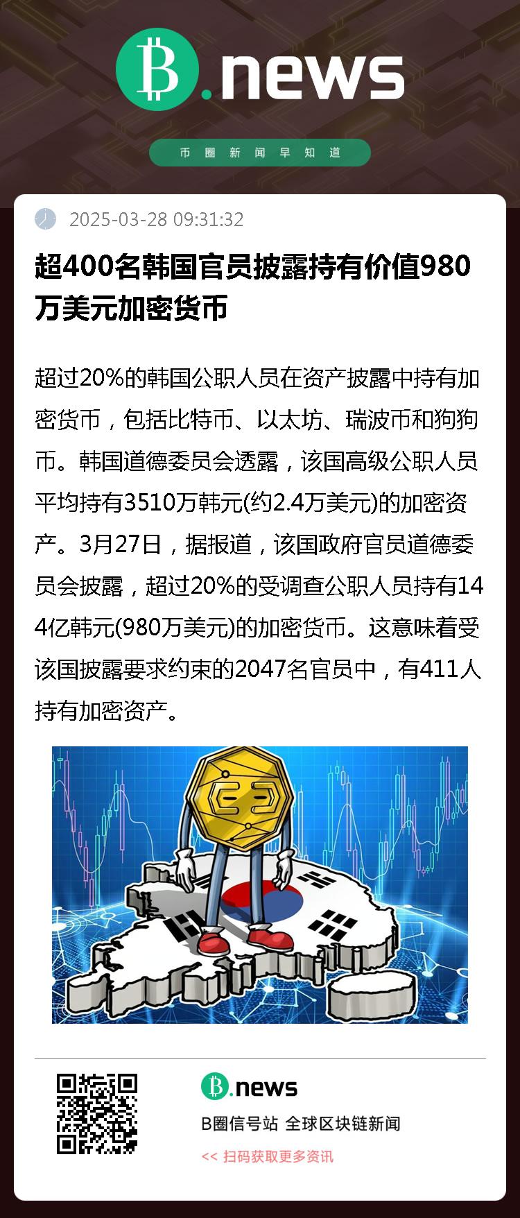韩国道德委员会透露,该国高级公职人员平均持有3510万韩元(约2.4万美元)的加密资产。