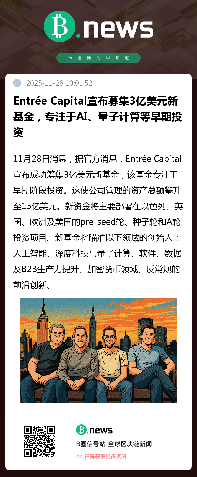 11月28日,据官方消息,Entrée Capital 宣布成功完成一只规模达3亿美元的新基金募集。该基金将重点聚焦于全球范围内的早期创业项目,进一步巩固公司在早期投资领域的布局。此次募资也使得 Entrée Capital 管理的资产总额提升至15亿美元,显示出市场对其投资策略与执行能力的高度认可。