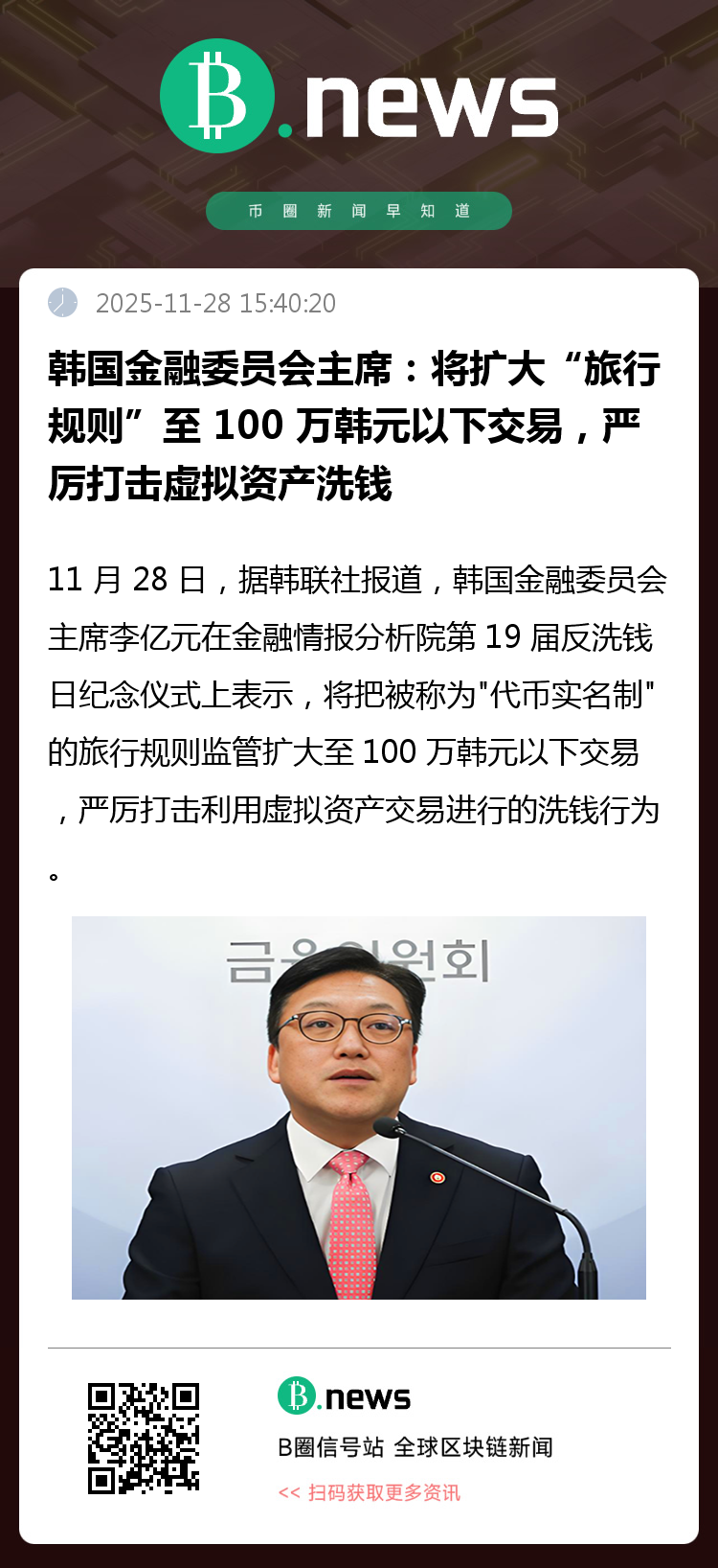 11 月 28 日,据韩联社报道,韩国金融委员会主席李亿元在金融情报分析院第 19 届反洗钱日纪念仪式上表示,将把被称为"代币实名制"的旅行规则监管扩大至 100 万韩元以下交易,严厉打击利用虚拟资产交易进行的洗钱行为。