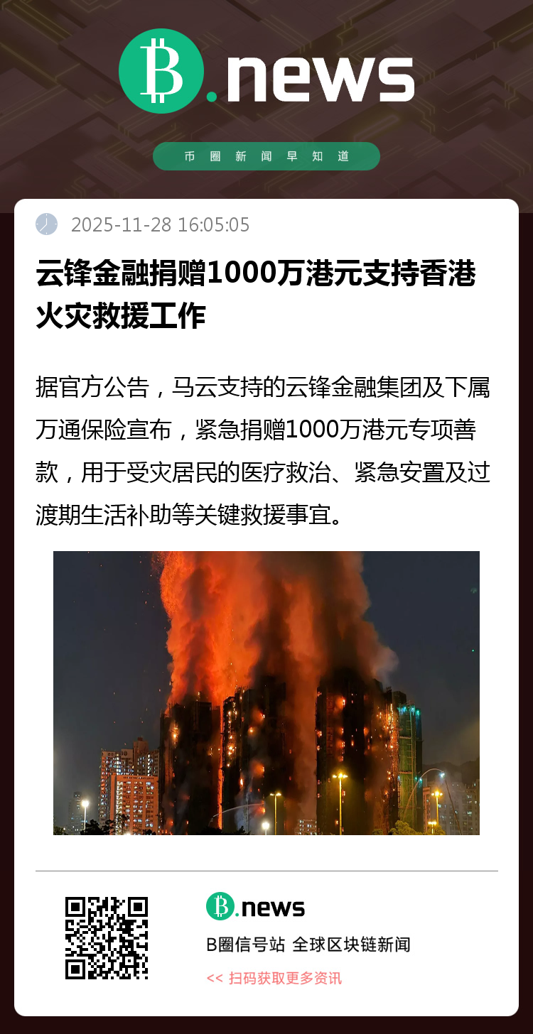 云锋金融捐赠1000万港元支持香港火灾救援工作