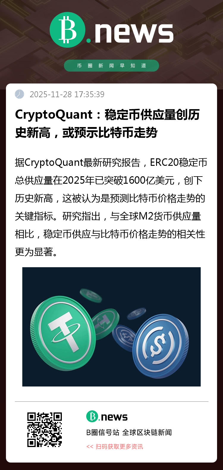 据CryptoQuant最新研究报告,ERC20稳定币总供应量在2025年已突破1600亿美元,创下历史新高,这被认为是预测比特币价格走势的关键指标。研究指出,与全球M2货币供应量相比,稳定币供应与比特币价格走势的相关性更为显著。