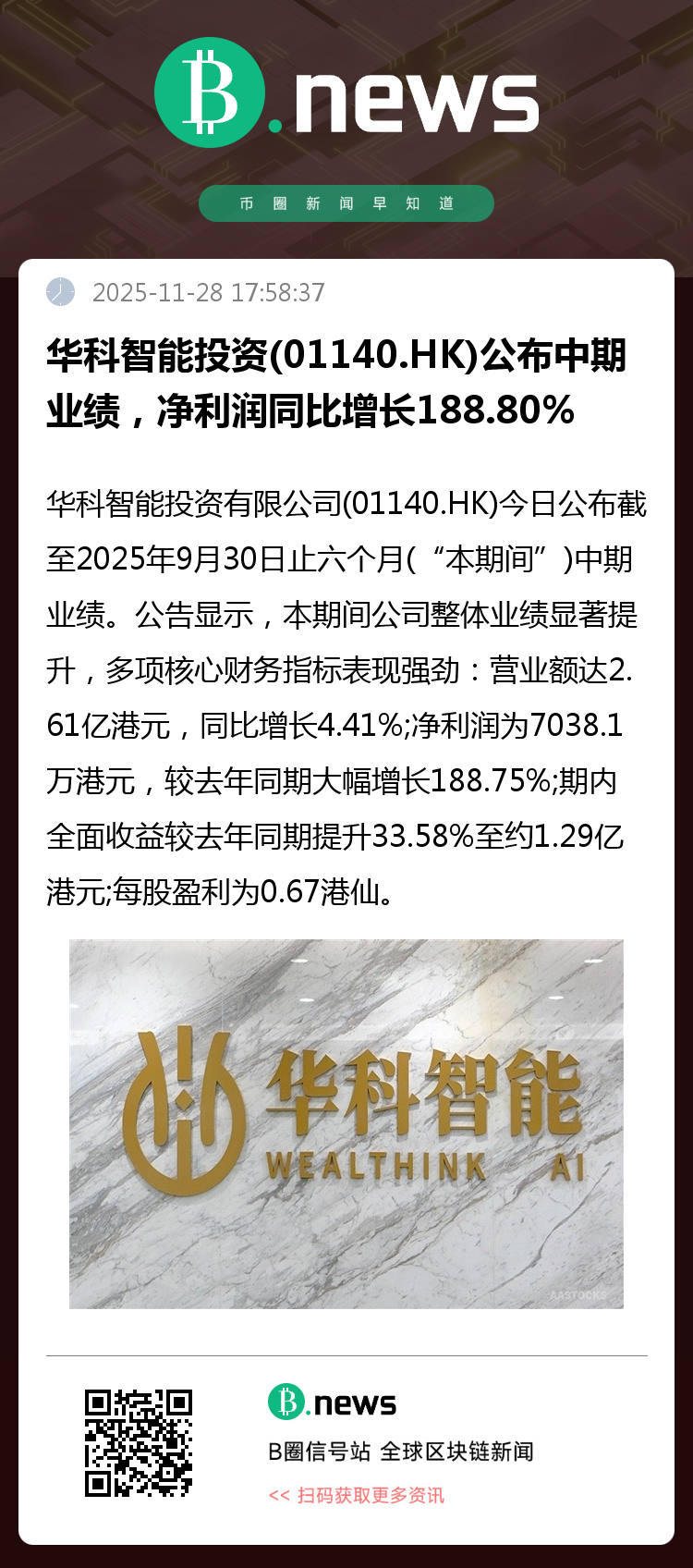 华科智能投资有限公司(01140.HK,以下简称“华科智能投资”或“公司”)今日公布截至2025年9月30日止六个月(“本期间”)中期业绩。公告显示,本期间公司整体业绩显著提升,多项核心财务指标表现强劲:营业额达2.61亿港元,同比增长4.41%;净利润为7038.1万港元,较去年同期大幅增长188.75%;期内全面收益较去年同期提升33.58%至约1.29亿港元;每股盈利为0.67港仙。