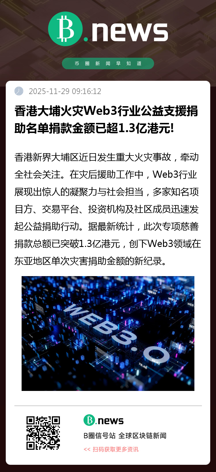 香港新界大埔区发生重大火灾事故,牵动全社会关注。在灾后援助工作中,Web3行业展现出惊人的凝聚力与社会担当,多家知名项目方、交易平台、投资机构及社区成员迅速发起公益捐助行动。据最新统计,此次专项慈善捐款总额已突破1.3亿港元,创下Web3领域在东亚地区单次灾害捐助金额的新纪录。