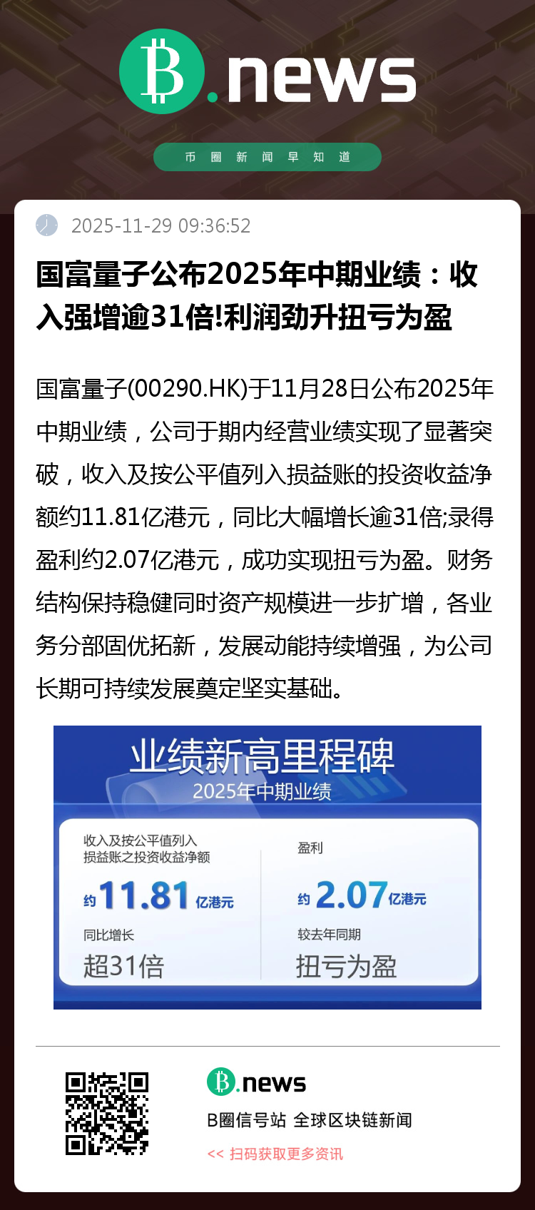 国富量子创新有限公司(00290.HK)于11月28发布截至2025年9月30日止六个月中期业绩,经营表现实现显著突破。期内收入大幅增长逾31倍,利润端扭亏为盈,资产规模持续扩大,财务结构保持稳健,各业务板块协同发展,为公司长远成长奠定坚实基础。
