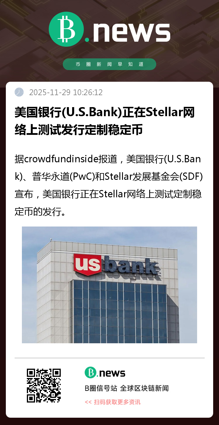 据crowdfundinside报道,美国银行(U.S.Bank)、普华永道(PwC)和Stellar发展基金会(SDF)宣布,美国银行正在Stellar网络上测试定制稳定币的发行。