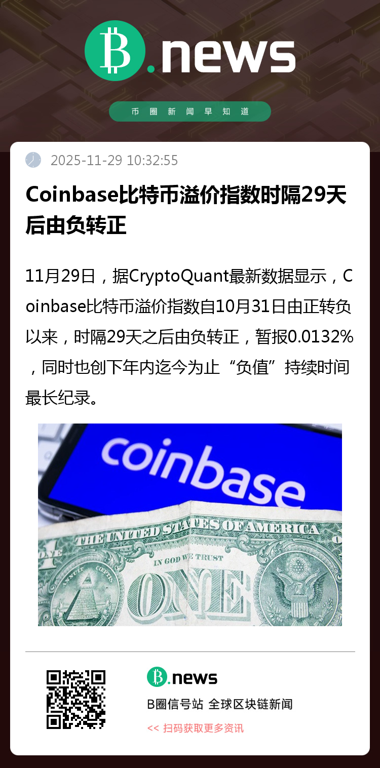 11月29日,据CryptoQuant最新数据显示,Coinbase比特币溢价指数自10月31日由正转负以来,时隔29天之后由负转正,暂报0.0132%,同时也创下年内迄今为止“负值”持续时间最长纪录。