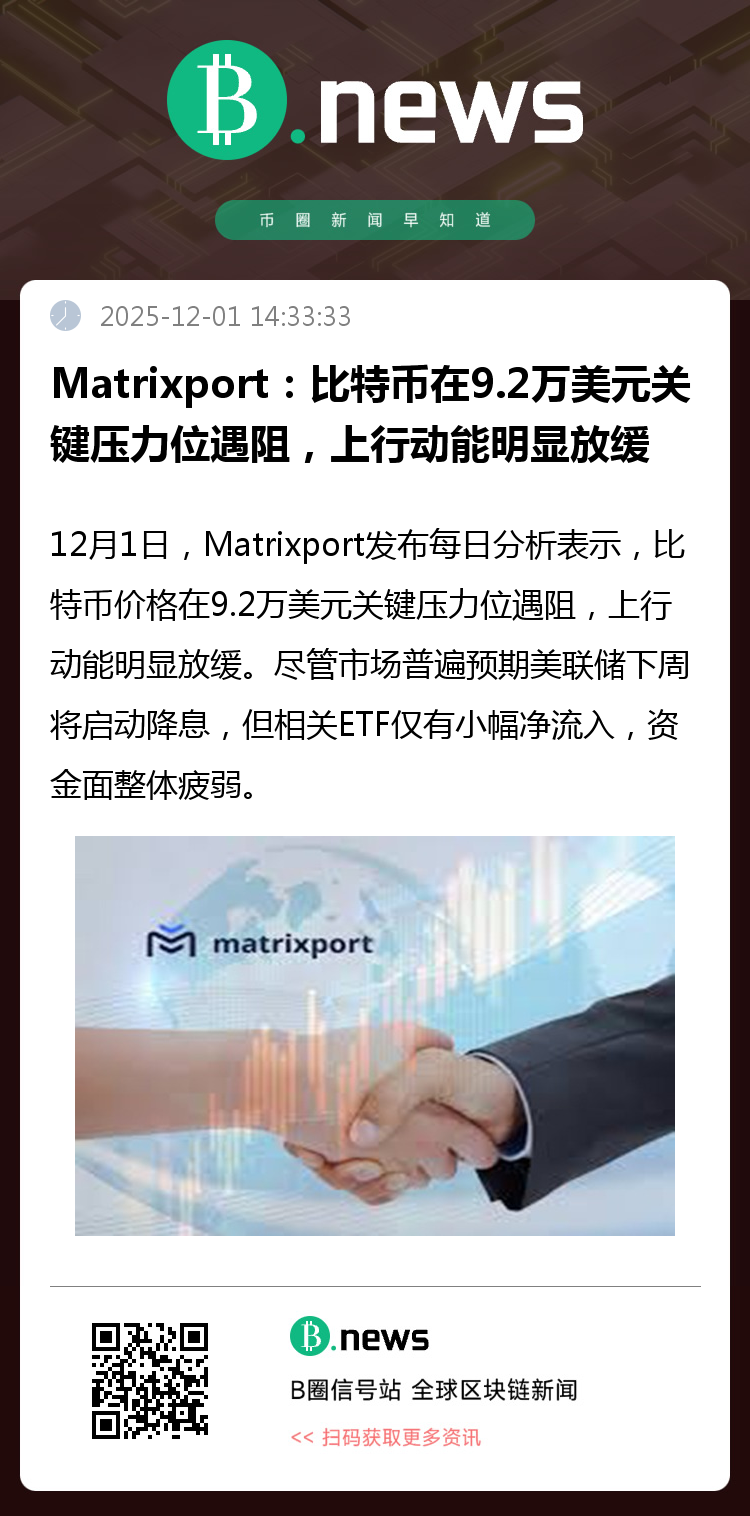 12月1日,Matrixport发布每日分析表示,比特币价格在9.2万美元关键压力位遇阻,上行动能明显放缓。尽管市场普遍预期美联储下周将启动降息,但相关ETF仅有小幅净流入,资金面整体疲弱。同时,日本货币政策收紧信号加剧市场不安,2年期日本国债收益率自2008年以来首次突破1%,引发投资者重新评估全球主要央行宽松步调一致性。分析师认为,即使美联储释放偏鸽信号,也难以抵消其他经济体的收紧预期,整体政策环境依旧偏紧,促使机构投资者继续降低比特币敞口。