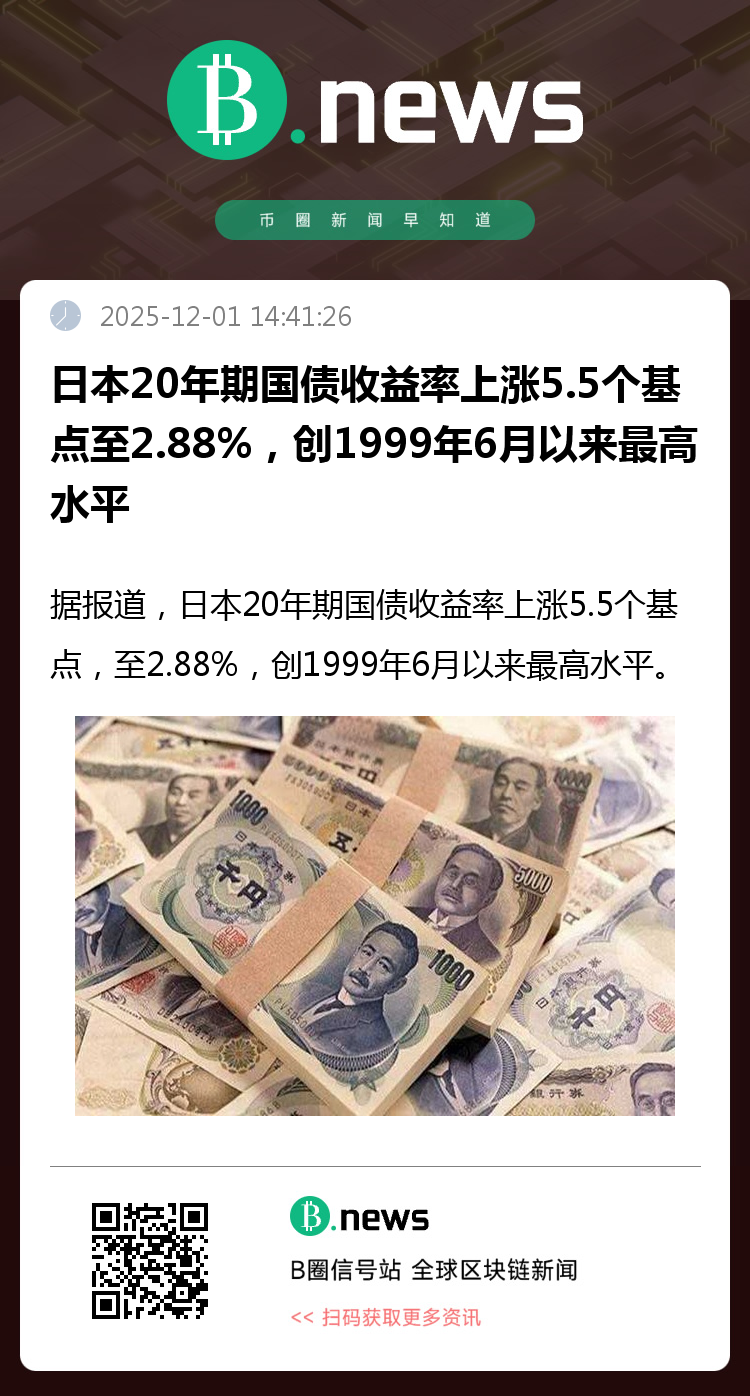 据报道,日本20年期国债收益率上涨5.5个基点,至2.88%,创1999年6月以来最高水平。