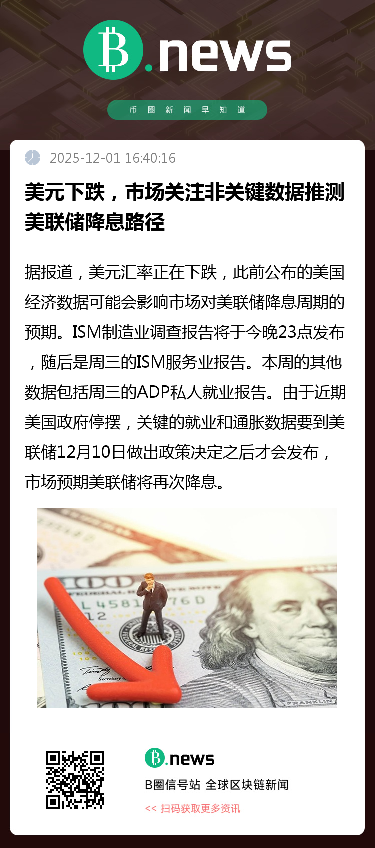 据报道,美元汇率正在下跌,此前公布的美国经济数据可能会影响市场对美联储降息周期的预期。ISM制造业调查报告将于今晚23点发布,随后是周三的ISM服务业报告。本周的其他数据包括周三的ADP私人就业报告。由于近期美国政府停摆,关键的就业和通胀数据要到美联储12月10日做出政策决定之后才会发布,市场预期美联储将再次降息。