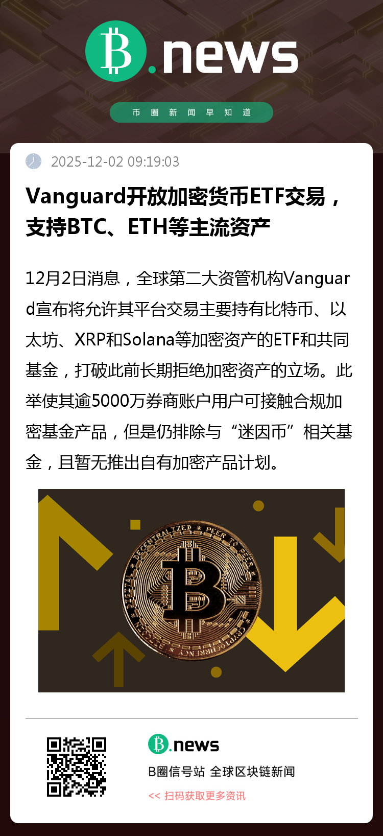 12月2日,据彭博社报道,全球第二大资产管理公司Vanguard集团已正式调整其长期以来的加密货币政策,宣布将允许客户通过其经纪平台交易主要投资于比特币、以太坊、XRP及Solana等主流加密资产的ETF和共同基金。这一决定标志着该机构对加密资产态度的显著转变,打破了其过去多年拒绝涉足该领域的立场。