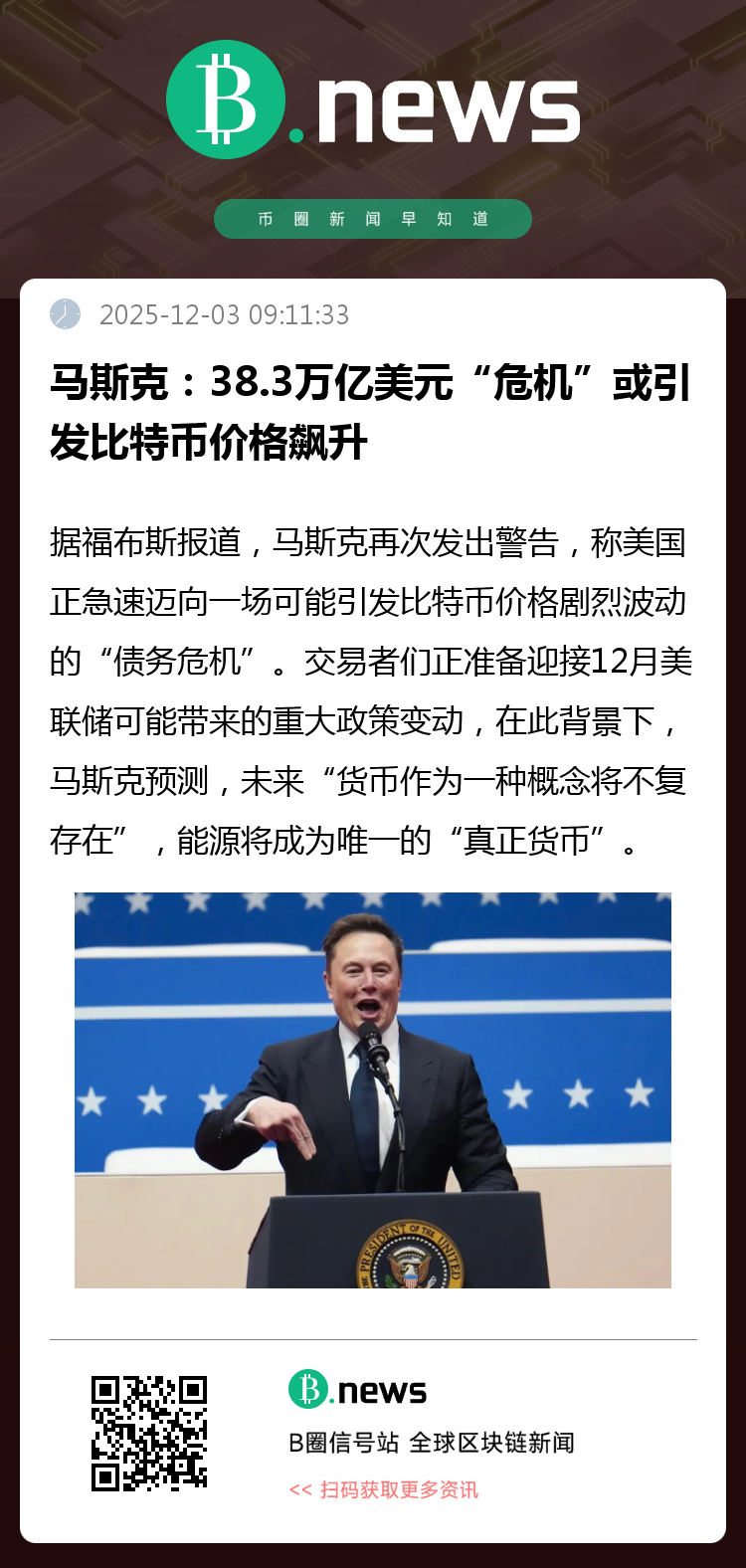 据《福布斯》报道,埃隆·马斯克近日再次发出警告,指出美国正迅速滑向一场可能引发比特币价格剧烈震荡的“债务危机”。随着交易者密切关注美联储12月可能出台的重大政策调整,马斯克进一步预测:“货币作为一种概念未来将不复存在”,而能源将成为唯一的“真正货币”。