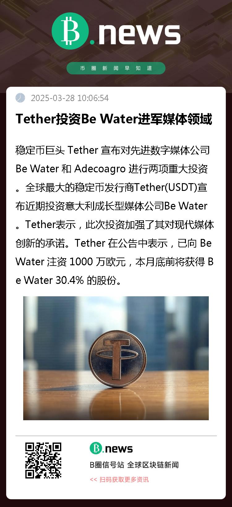 稳定币巨头 Tether 宣布对先进数字媒体公司 Be Water 和 Adecoagro 进行两项重大投资。