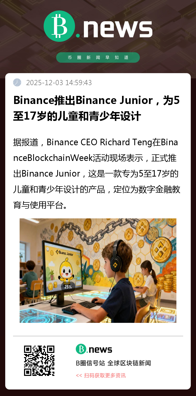 据报道,Binance CEO Richard Teng在BinanceBlockchainWeek活动现场表示,正式推出Binance Junior,这是一款专为5至17岁的儿童和青少年设计的产品,定位为数字金融教育与使用平台。